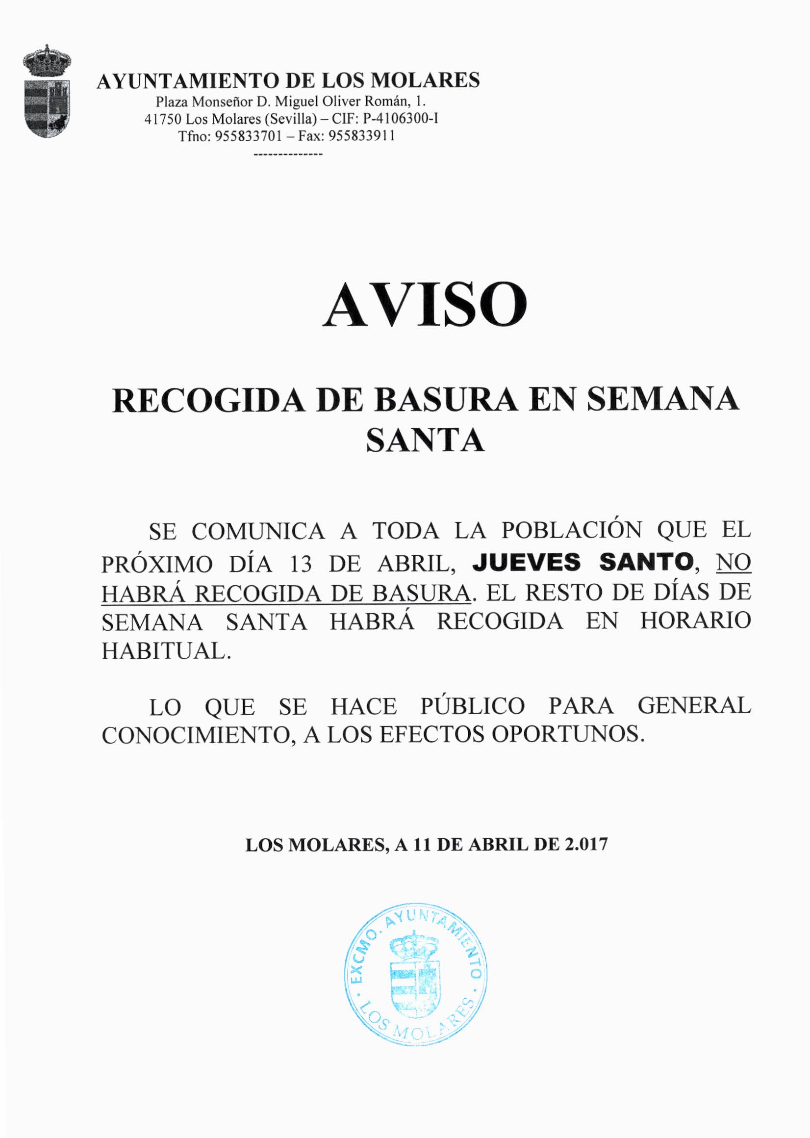 AVISO: RECOGIDA DE BASURA EN SEMANA SANTA