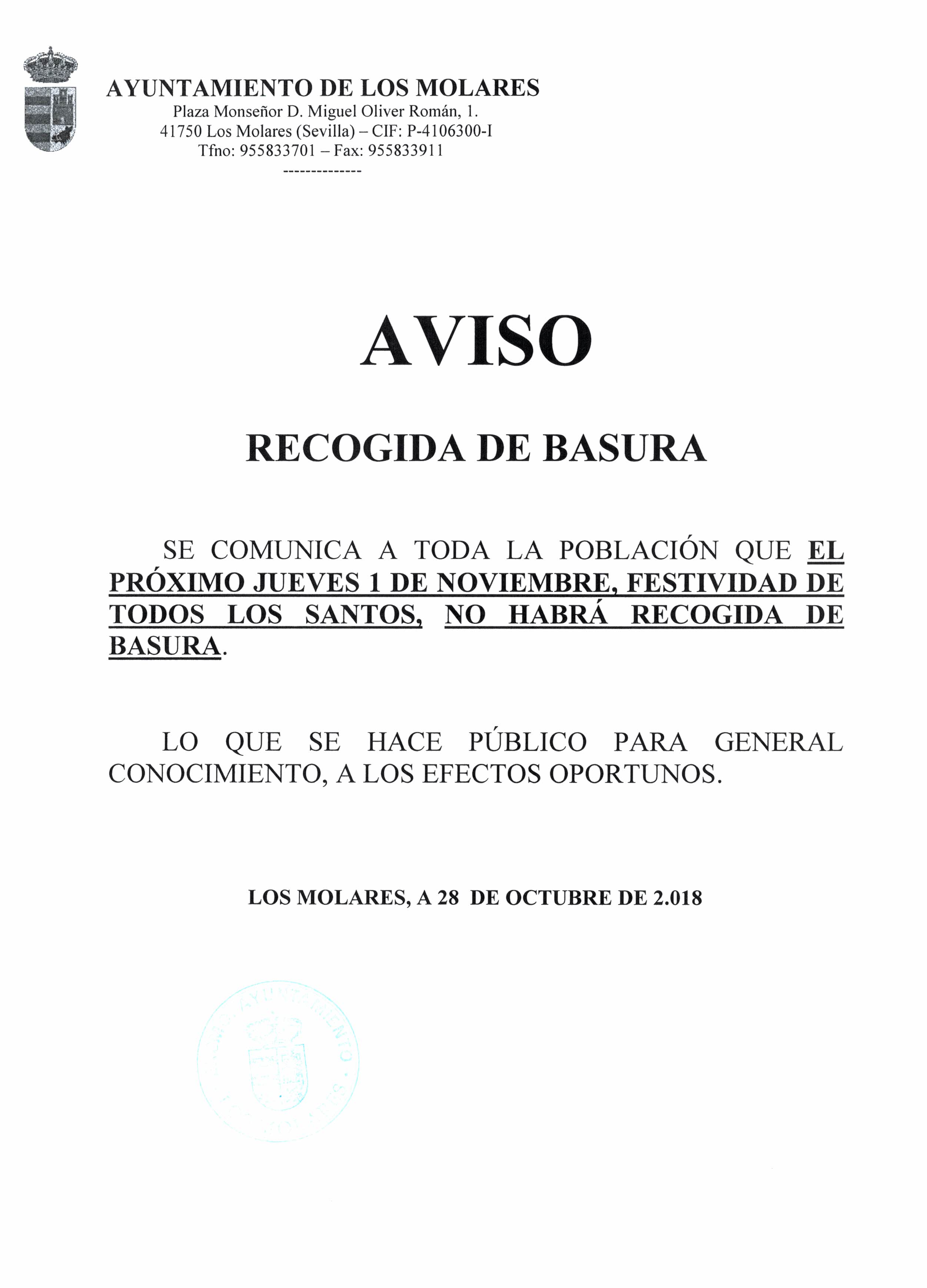 Aviso de Recogida de Basuras, Festividad de todos los Santos