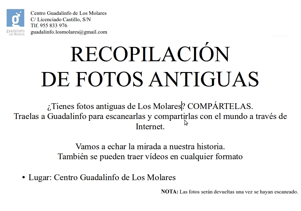 Si quieres compartir fotos antiguas de Los Molares, acude a tu Centro Guadalinfo. Para más información pincha en el siguiente enlace: