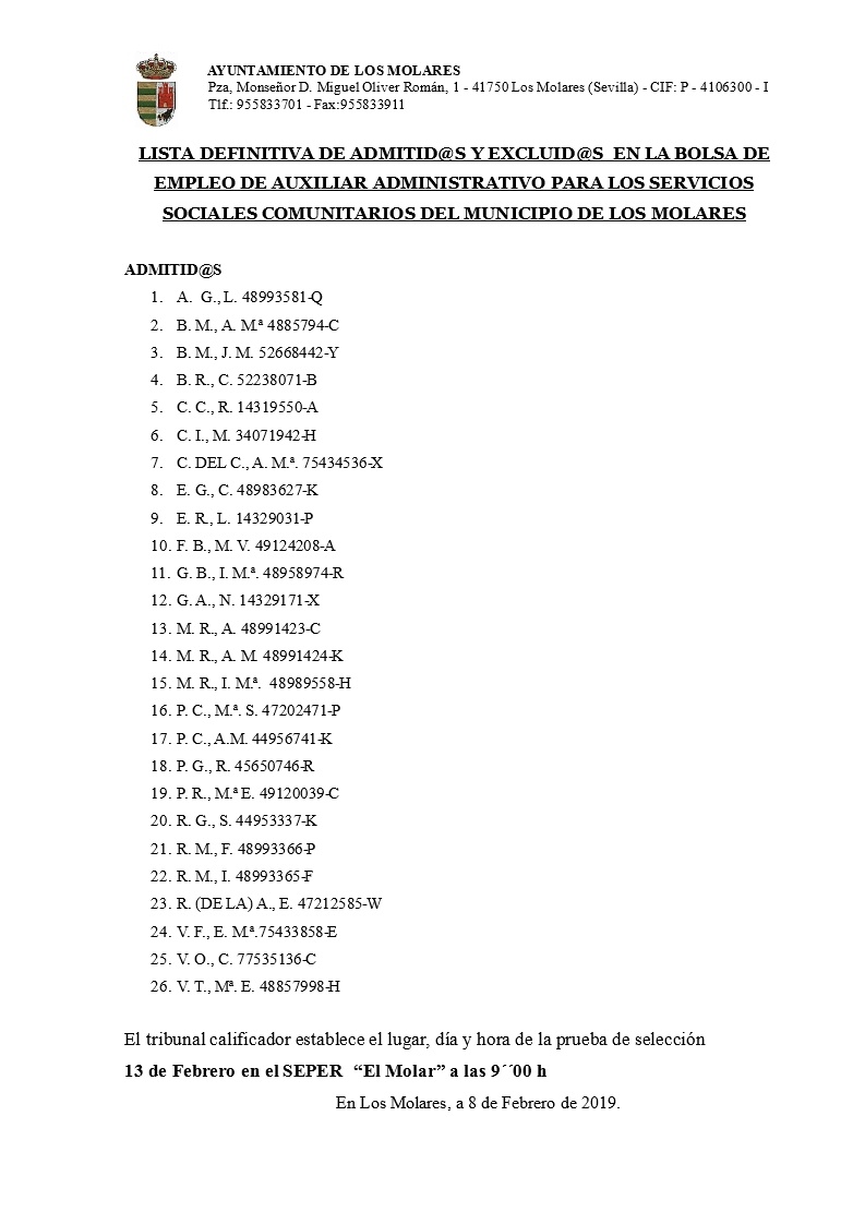Publicado el listado definitivo de aspirantes admitidos y excluidos para las dos plazas convocadas por el Ayuntamiento denominadas Oficial Alicatadores.