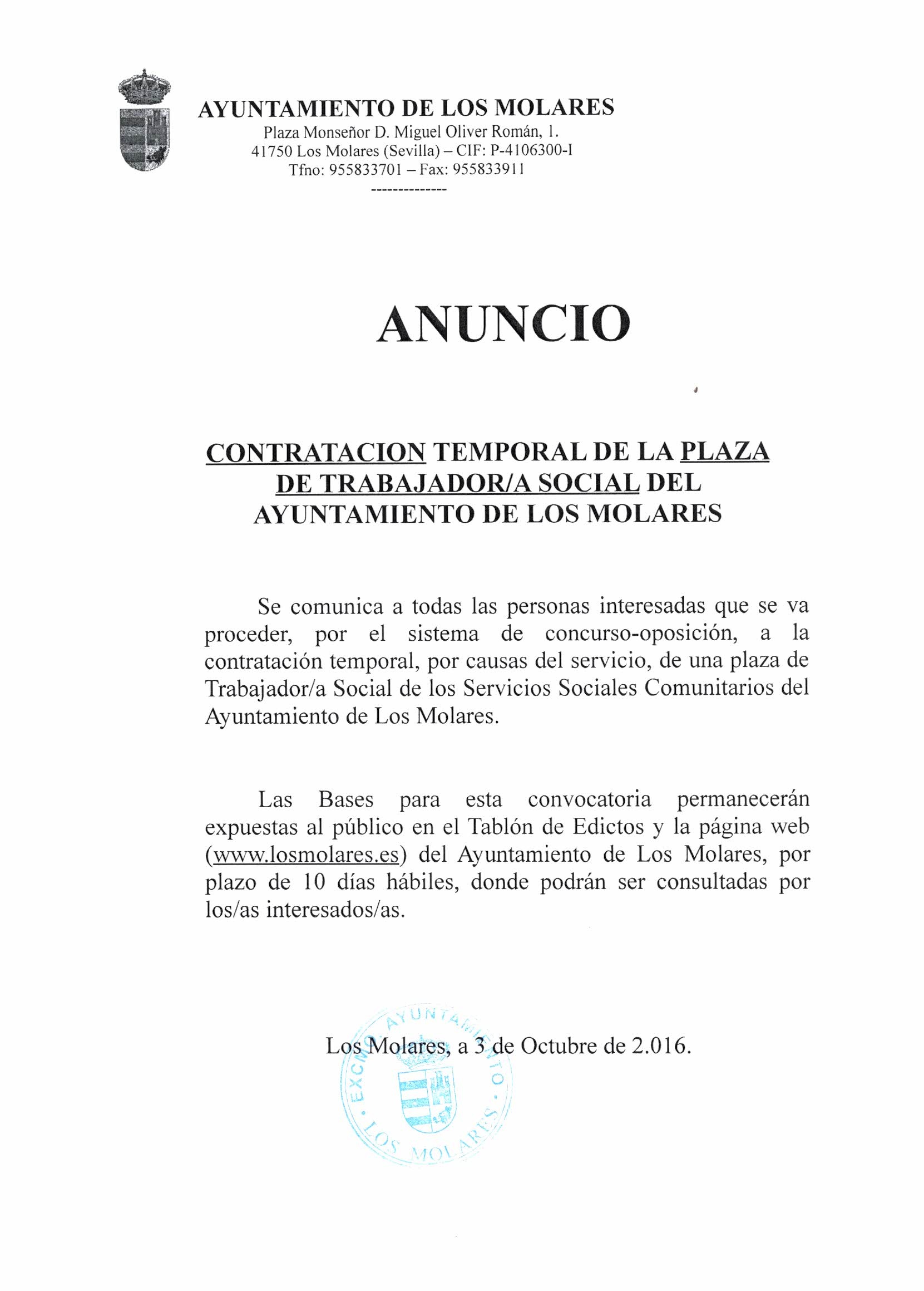 ANUNCIO: CONTRATACION TEMPORAL DE LA PLAZA DE TRABAJADOR/A SOCIAL DEL AYUNTAMIENTO DE LOS MOLARES
